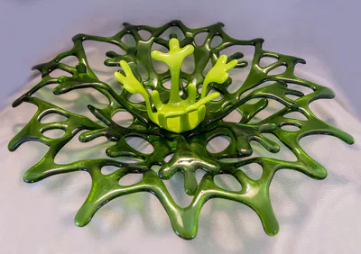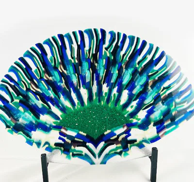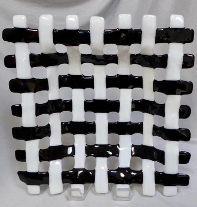 “Baskets” are pieces where hand cut strips of glass are carefully arranged on a kiln shelf to be fused together. The arranged pieces of glass generally create a snow flake like geometric pattern. Several examples of glass basket pieces are shown below. In all cases, glass baskets are designed with voids. As such, they are more delicate than solid glass bowls.