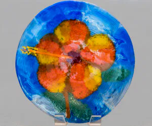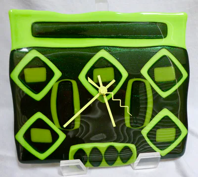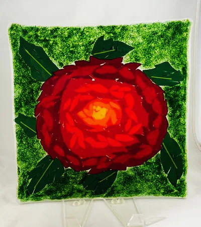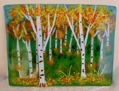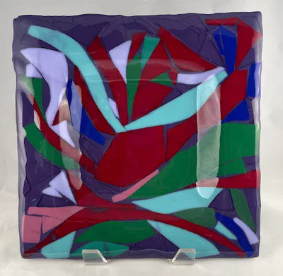 “Mosaics” are pieces where hand cut glass is arranged on a base piece of glass to be fused to create a design of interest. The design might be an impressionistic picture, or a pattern of interest, or an abstract. Examples are shown below.