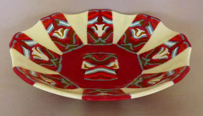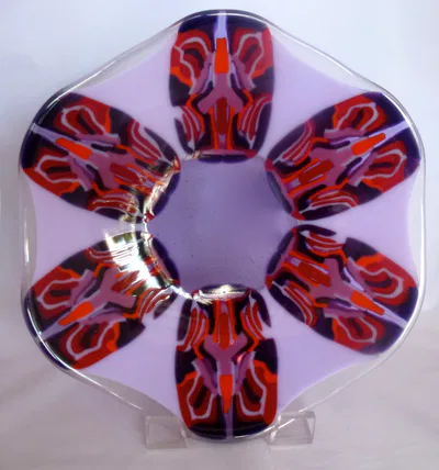 “Pattern Bars” are pieces of color compatible glass, first fused to form a loaf, then sliced with a diamond blade tile saw into “bars” of various thicknesses, depending on your final intended fusing plan. Bars are often “book ended” to form a pattern that is geometrically pleasing, then combined with other glass to create the desired piece. Several examples of pieces using pattern bars are shown below.