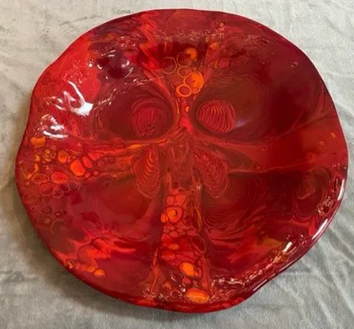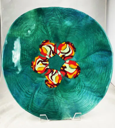 “Drop Pot” is a technique that offers the least control on the outcome other than basic color and size. Chemically compatible glass is stacked in a terra cotta flower pot which is then carefully suspended above a kiln shelf and fired to a high temperature (1600 degrees) for several hours. Molten glass drips down from the flower pot on to the kiln shelf. The pooling glass on the shelf creates an “organic” (meaning uncontrolled) pattern of swirls. A couple of drop pot examples are shown below. Sometimes the resulting piece isn’t particularly interesting. One can then use the piece as a back ground and over lay additional glass as a design. Two examples are also shown below.